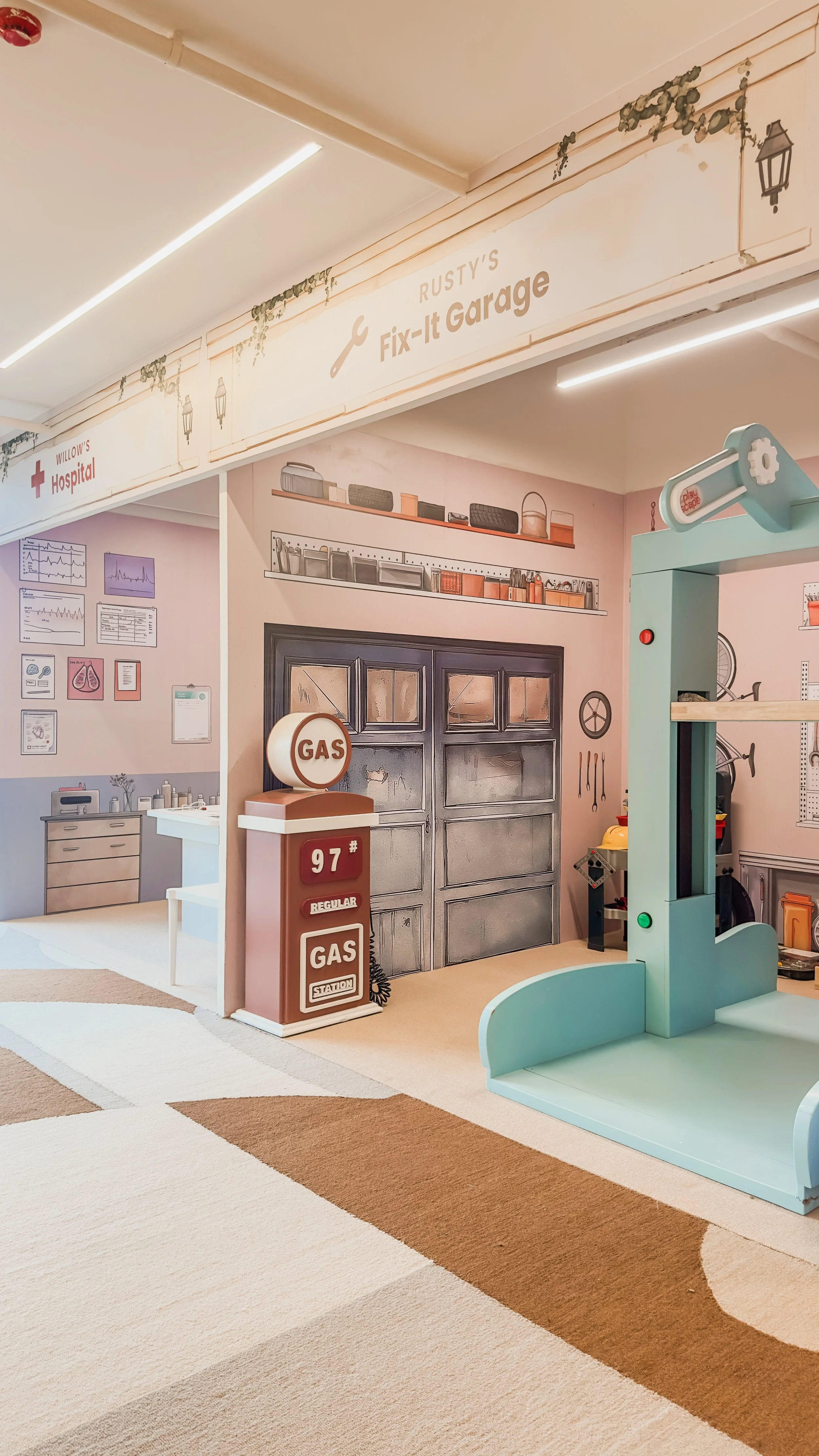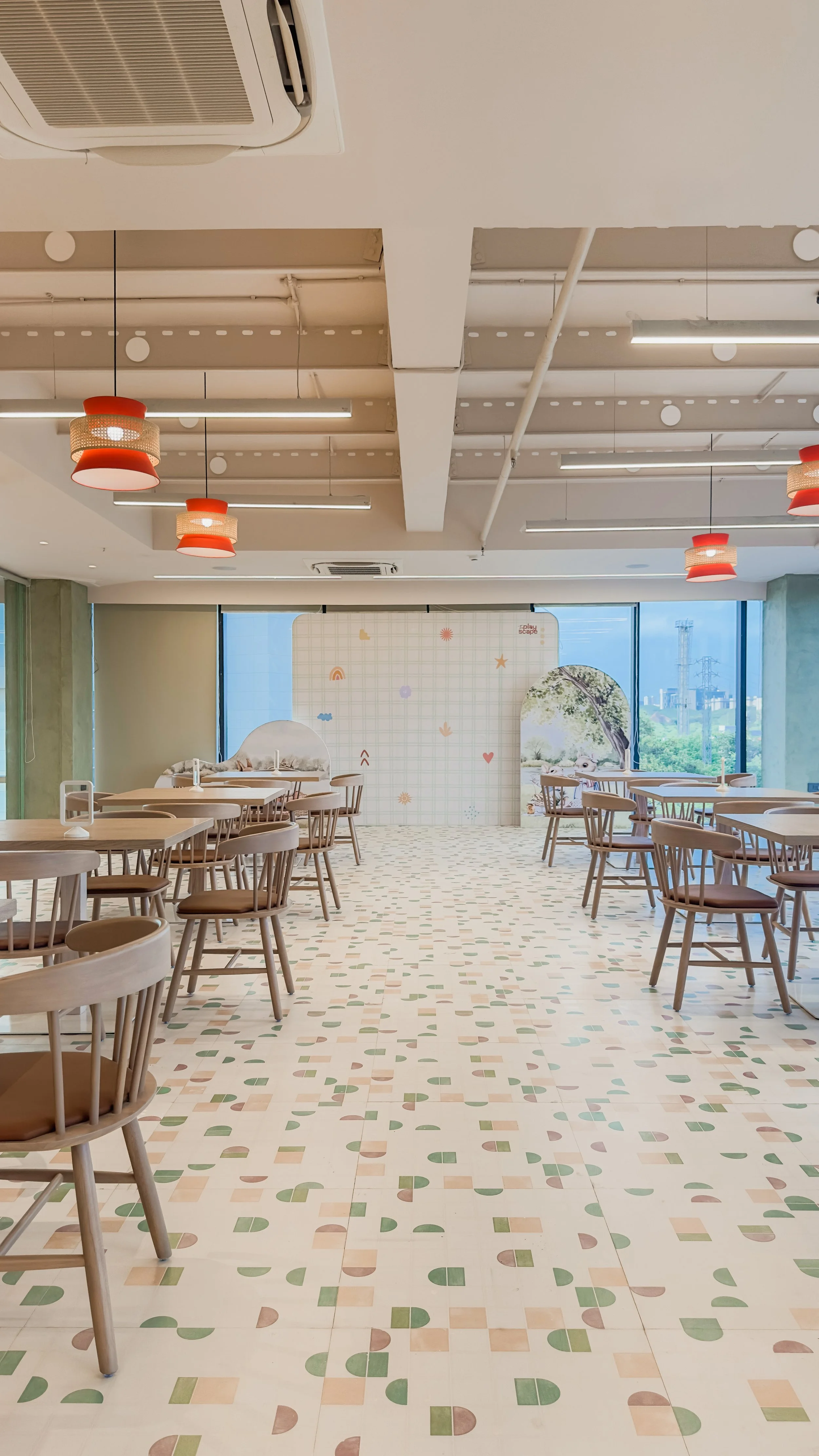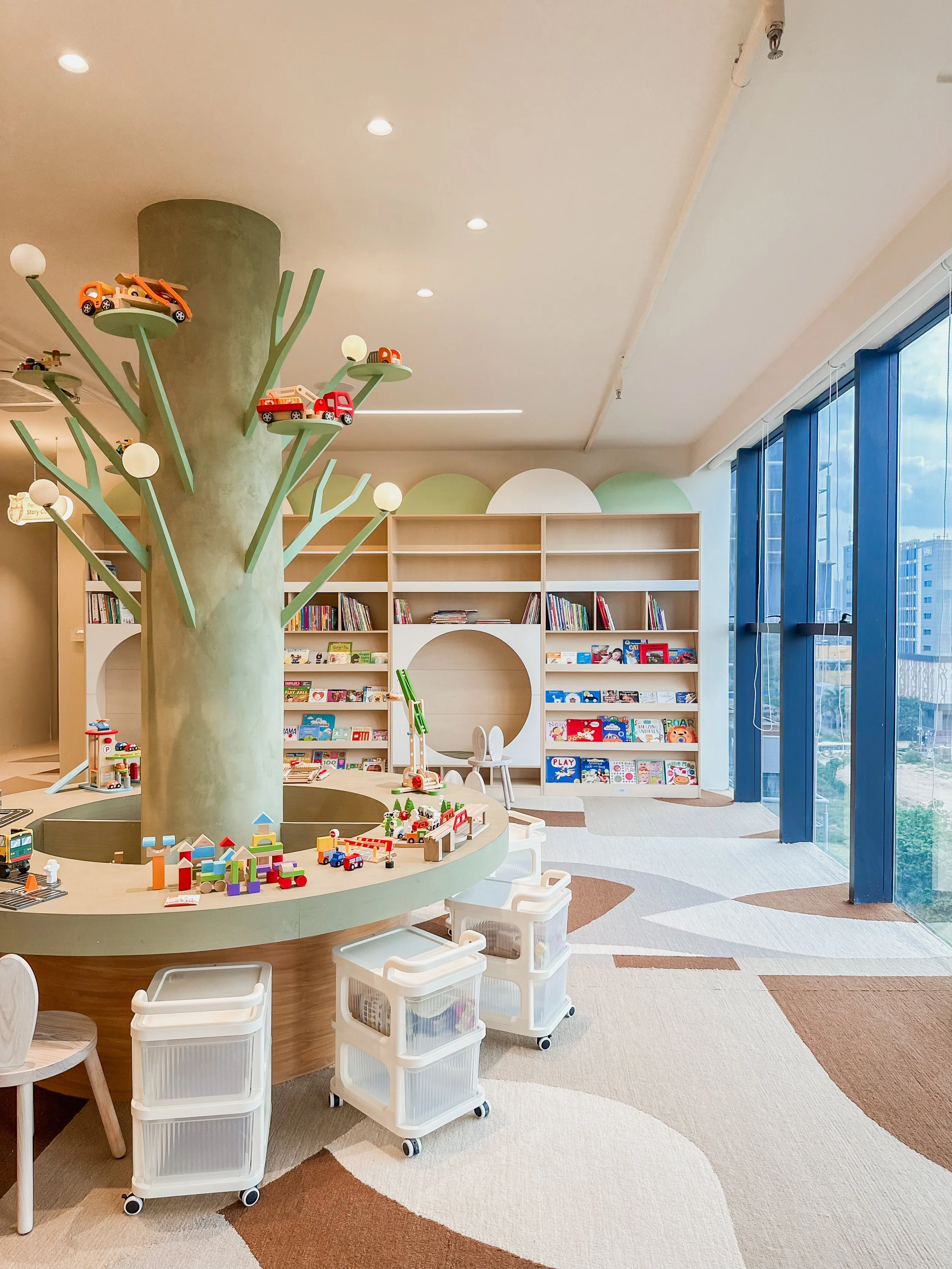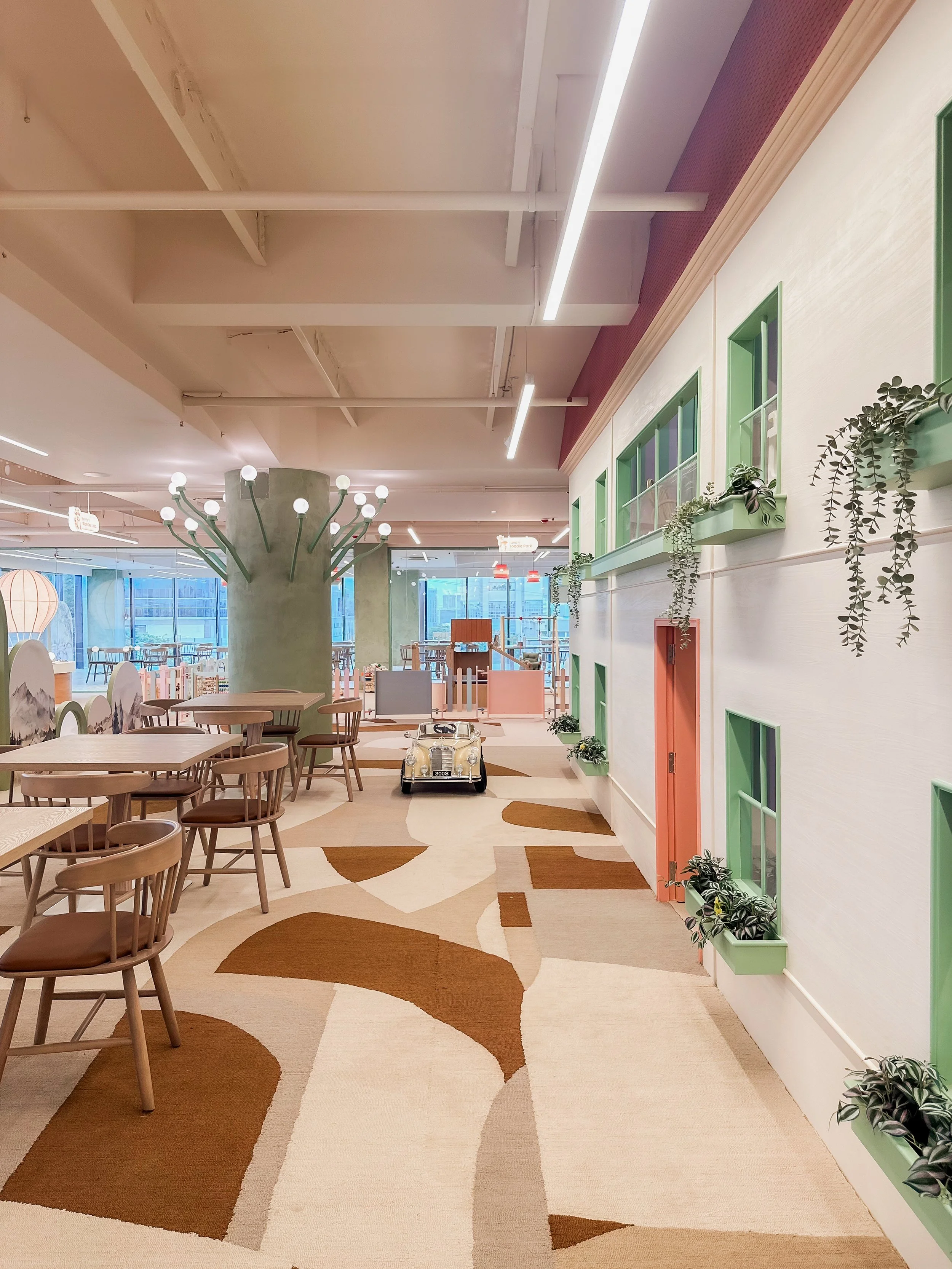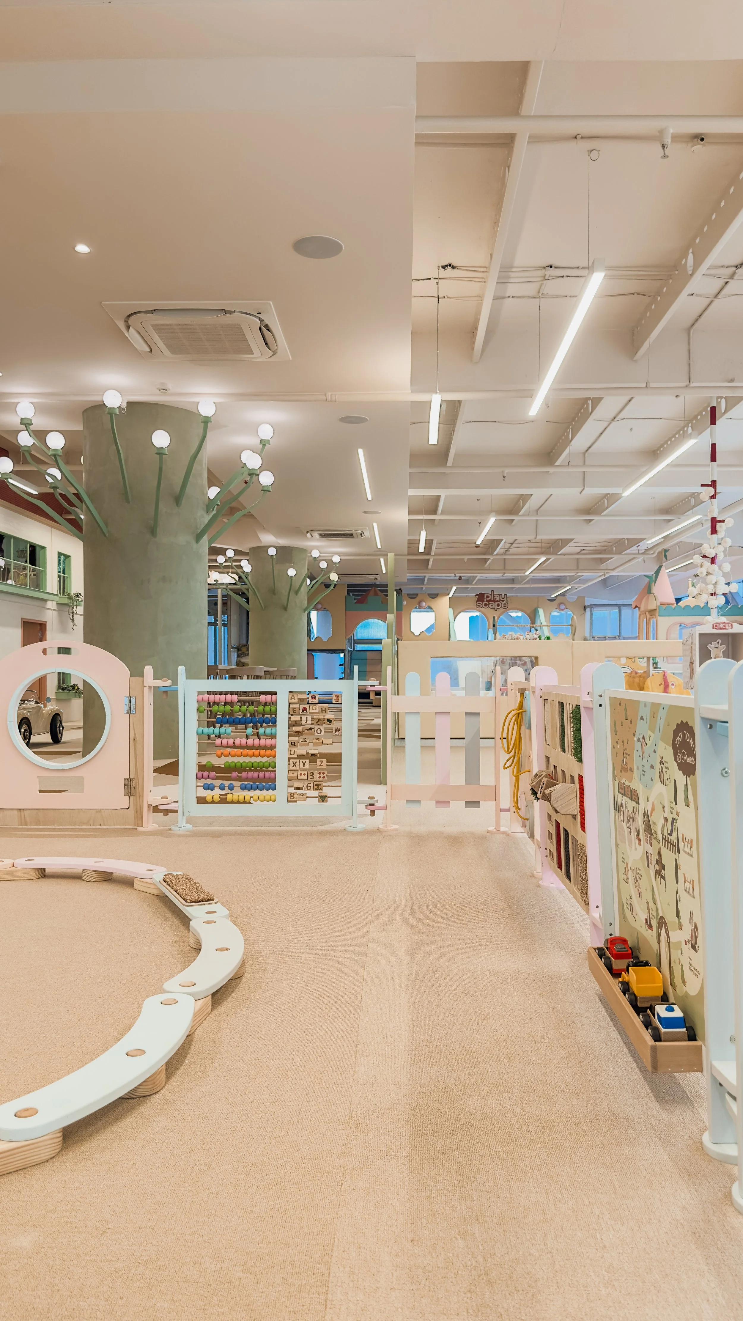 Playscape is a storybook-inspired space where spatial design unfolds like an engaging narrative. Designed as an illustrated wonderland, it brings childhood imagination to life through whimsical environments. Each play zone features characters that recur in wall illustrations, furniture, and interactive elements, with mascot Juno guiding children on a journey of discovery. Wayfinding is enhanced by enchanted, glazed trees that serve as landmarks, while arched partitions, framed with character art, define areas without disrupting the visual flow of the central “tiny town.” Every detail—materials, muted palettes, curves, and sightlines—evokes wonder and encourages exploration, creating a cohesive world where play and purpose blend seamlessly.